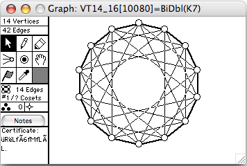 There are 51 connected vertex-transitive graphs on 14 vertices. The 8 of degree 6 (hence 42 edges) are shown here.